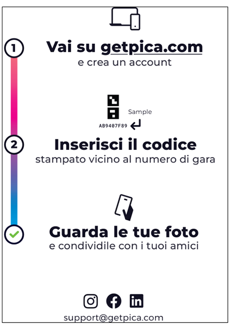 Tutte le fotografie delle gare del sabato e domenica della 41° Granfondo Val Casies 2025 saranno online da lunedì 17 Febbraio. Basta collegarsi al sito www.getpica.com registrarsi ed inserire il codice alfanumerico di 9 cifre che trovare sul vs pettorale di gara. Per qualsiasi necessità contattare [email protected] Prego conserva il pettorale per guardare in seguito le foto